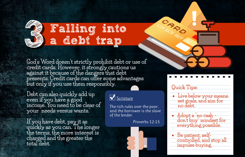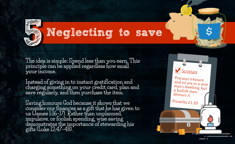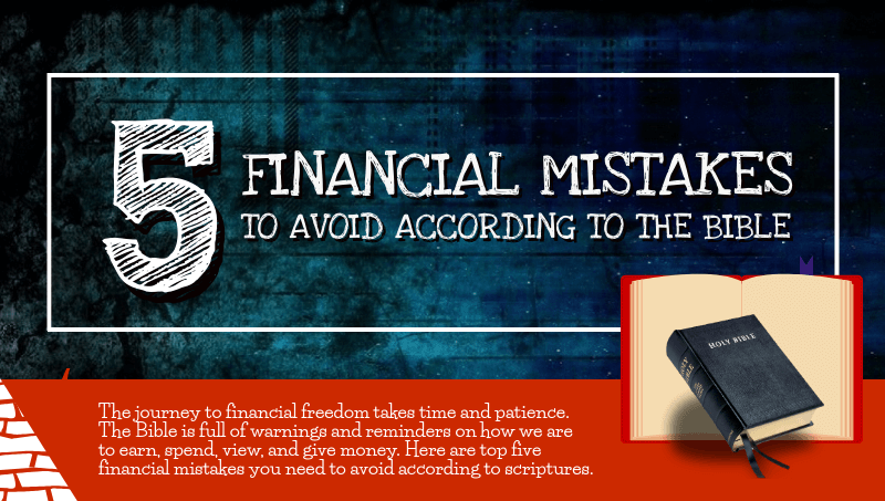 Five Financial Mistakes To Avoid According To The Bible [Infographic] Post published:March 29, 2019 Post category:Articles / Infographics Post comments:0 Comments The Bible is full of instructions about financial stewardship. It is also gives us warnings against financial foolishness. Learn the top five financial mistakes you need to avoid based on God’s Word. You Might Also Like 7 Simple Principles of Financially Competent People January 3, 2018 Infographic: Investing – The Principle of Steady Plodding [Infographic] April 18, 2018 Five Practical Things You Need to Do If You Want to Get Out of Debt August 16, 2017 Leave a Reply Cancel replyCommentEnter your name or username to comment Enter your email address to comment Enter your website URL (optional) Save my name, email, and website in this browser for the next time I comment. Please enter an answer in digits:two × five =